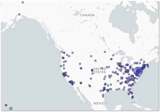 Geographic location of respondents. Figure created in R mapview package; area of circles represents the number of respondents in that US zip code.