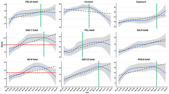 Cross-sectional timeline responses to standard assessment scores and subscores over the course of the pandemic. The top row includes perceived stress (PSS-14) and the derived COVID-19-specific questionnaire scales. The middle row includes measures of anxiety (GAD-7 total) and somatization (PILL, SSS-8). The bottom row is for PTSD-like symptomatology (IES-6), somatization (SSD-12), and depression (PHQ-9). The red dotted horizontal line indicates the screening cutoffs for GAD-7 (10) and IES-6 (1.75), and the green dotted vertical line shows the month and year at which the trend deflects as per the change point analysis. The blue line is loss curve with standard error (se) shading. The black dotted line is a linear model fit (regression line). The figure was created with R ggplot2.