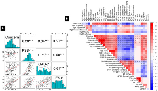 Partial correlations for the survey scales and subscales. (A) Lower triangle consists of a scatterplot showing linear regression lines and convex hulls for the PSS-14 total, GAD-7 total, and IES-6 total. Histograms for each measure are shown on the diagonal, and the r values on the upper triangle. (B) Correlogram of all survey scales and subscales, with red for positive and blue for negative correlations. Asterisks in A and B represent Benjamini–Hochberg corrected p-values: * = p < 0.05, ** = p < 0.01, *** = p < 0.001.