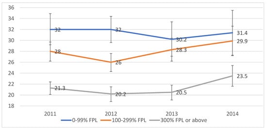 This study used data of California adults to show that lower family income was positively associated with obesity from 2011 to 2014. The findings for the association among overall population were similar when each survey cycle was examined. However, the magnitude of the income disparity decreased during this period, which is different from a study using CHIS from 2001–2007 []. In that study, differential trends were observed in obesity over time among lower-income children relative to higher-income adults. It was hypothesized that obesity prevalence likely increased more among lower-income adults than among higher-income adults, which is inconsistent with our findings, i.e., obesity prevalence has increased more among those with higher incomes. Although people with high incomes are likely to have access to greater resources that may better protect them from preventable conditions, they may not behave as expected to consume healthy foods. Despite a reduced magnitude of the income disparity, the prevalence of obesity remains higher in adults with lower family income than those with higher family income in each survey year; and adjusted analyses confirm an inverse association between family income and obesity, suggesting a necessity of ameliorating poverty status to have better access to healthy foods.