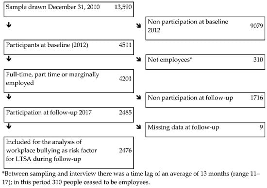 We used data from the German Study on Mental Health at Work (S-MGA), which is a nation-wide representative employee cohort study with a baseline survey in 2012 and a follow-up survey in 2017 []. At baseline, the target population consisted of all individuals employed in Germany as of 31 December 2010, born in 1951–1980 []. The study population was enrolled through the register of Integrated Employment Biographies (IEB) of the German Federal Employment Agency at the Institute for Employment Research (IAB). This register covers all employees subject to social security contributions, thus excluding civil servants, self-employed workers and freelancers. The analysed cohort included 2476 persons that were employed at baseline (Figure 1). In the main analysis, participants were followed up between 2012 and 2017 for their first episode of LTSA.
