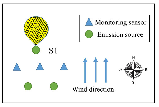 Figure 2 shows a simple undetectable case to illustrate the concept of APE detectability and its influencing factors. There are 3 monitoring stations and 3 emission sources, and the wind direction is northward. In this wind direction, . The area marked by the grid represents the plume from the source S1, which cannot be detected by all the monitoring sensors. When S1 emits the contaminants excessively and the emission rates of other sources are assumed to be the same as the mean, the concentration measurements are unchanging no matter how large the emission rate of S1 is, and the indices and Q are zero, which means that the approach of the APE detection is not applicable in this situation. Actually, this condition is the same as the condition of traceability proposed in [22,40,41], which explains when the emission rates of the sources can be estimated uniquely using least squares. This illustrates whether an APE can be detectable, and whether the emission source can be traceable relies on totally identical criteria.