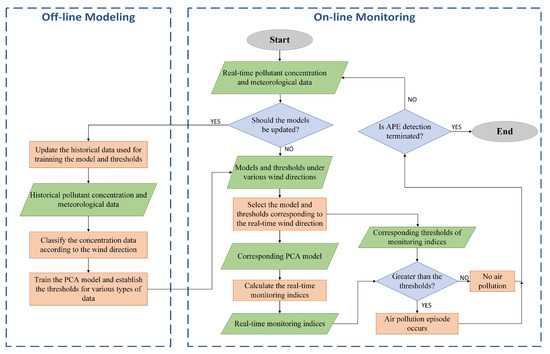 The overall workflow diagram is shown in Figure 3. The PCA approach for APE detection has two phases, offline modeling and on-ine monitoring. In the offline phase, the concentration data are divided into some subsets according to the wind direction in the first step. Then, the PCA models and monitoring thresholds of all the subsets are created. In the online phase, based on the direction, the corresponding thresholds and model are chosen first. After that, whether the APE occurred is determined based on the real-time measurements from AQMN.