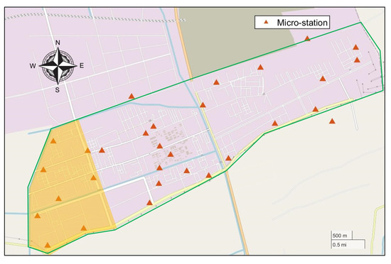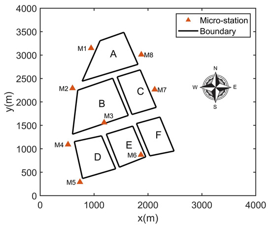 In order to make the case easier to describe and verify the feasibility of the method above more effectively, the scene is simplified in the simulation experiment. A part of the zone in the west of a CIP (the yellow shaded area in Figure 4) is selected. In this zone, there are six plants (A, B, C, D, E, and F) and eight fixed ambient micro-stations () fitted in the zone. The location diagram is shown in Figure 5. There are two assumptions in this experiment: