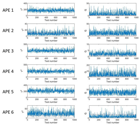 After feature extraction using PCA model, the raw high-dimensional data are projected into two orthogonal subspace [38], principal component subspace (PCS), and residual subspace (RS), respectively. Then, Hotelling’s and squared prediction error (SPE), Q, are built to detect the APEs, which represent the variability in PCS and RS, respectively. A graphical interpretation of and Q with two principal components (PC1 and PC2) is illustrated in Figure 1.