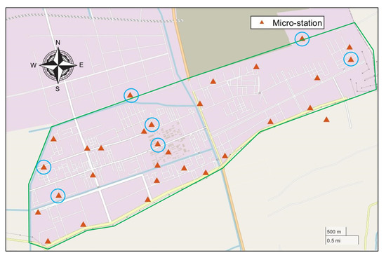 Map of the CIP. The green line represents the boundary of the CIP. Micro-stations circled in blue are stations with many missing data.