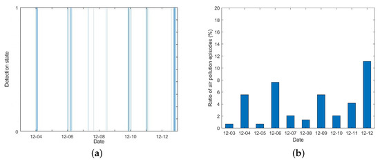 Air pollution episode detection results. Detection state. (a) If the detection rate is 1, an APE is detected. (b) Ratio of air pollution episodes detected per day.