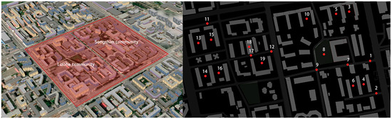 Harbin (125°420–130°440 E longitude, 10°040–46°400 N latitude) is the capital of Heilongjiang Province, China. The city is characterized by long winters, short and dry summers, and relatively short spring and autumn seasons. The present study selects the typical representative old residential areas of the Songshan community (Site A) and the Liaohe community (Site B) in Harbin as the research fields. The layout of Site A possesses a peripheral and determinant architecture, and the layout of Site B is an enclosed mode. As Figure 1 shows, the measuring points were arranged in a network format. P1, P2, P11, and P12 were located in the exterior walkway to test the sound pressure level (SPL) of the arterial street. P7, P9, and P17 were located inside the community to focus on the impact of noise on multi-story buildings. P8 and P18 were set in the square to focus on the effects of square dancing. Another test point was established to study the influence of different architectural forms on the acoustic environment.
