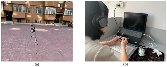 An AWA5680 sound level meter with a measurement range of 30–130 dB(A) was selected for this study [21]. According to the Acoustic Environmental Noise Measurement Method (GB/T 3222-94), the three daytime periods of 8:00–10:00, 14:00–16:00, and 19:00–21:00 were selected for measurement. In this test, the sound level meter was set to count every 10 s. Each point was continuously tested for 10 min, and each measuring point was tested for a total of 12 times. The distances between the measuring point, the reflector, and the outer wall were greater than 3.5 m and 1 m, respectively, and the probe height was set at 1.5 m (Figure 2a).
