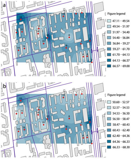 Figure 3 shows the SPL distribution of the study area. It can be seen from Figure 3 that the old multi-story residential area is seriously disturbed by noise far beyond China’s acoustic environmental quality standards (55 dB). Table 3 shows the maximum value of SPL during the different periods in the study area. As the table shows, during 8:00–10:00, the points along the street (P1, P2, P3, P4, P12, P13) appear to have a higher SPL, and the maximum interpolation reached 8.3 dB(A) among the points, which is similar during 19:00–21:00. This is because traffic noises dominate the acoustic environment during these periods. It is worth noting that the points on the square (P8, P9) appear to have a higher SPL during 19:00–21:00 because square dancing affects the acoustic environment during this time. The SPL distribution inside the community during 14:00–16:00 differs slightly, but the maximum interpolation reaches 24.1 dB(A) between the point inside the community and outside the road. The average SPL in Site A is lower than in Site B, concluding that the enclosed layout is superior to the determinant layout in noise reduction. It is worth noting that there are two 1-story illegal buildings around the measuring point 13–16. In the whole day SPL distribution, these buildings played a certain role in hindering the propagation of external traffic noise. The distribution of SPL values is 1.8 dB lower than that of the surrounding 8-story building area. Therefore, it can be seen that low-rise small buildings have a certain impact on the SPL distribution of the residential area.