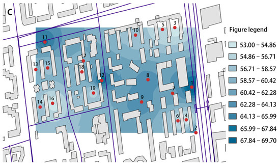 The SPL distribution of the study area during different periods (Unit: dB(A)): (a) 8:00–10:00, (b) 14:00–16:00, and (c) 19:00–21:00.
