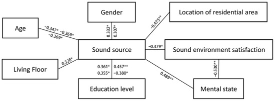 SPSS was used to process the questionnaire data. It was found that the age, educational background, occupation, and other social characteristics of interviewees had a particular impact on the evaluation of sound preference, which was similar to previous research results [31]. Figure 5 shows the correlation analysis results of subjects’ social characteristics, satisfaction with the acoustic environment, psychological state, and sound sources.