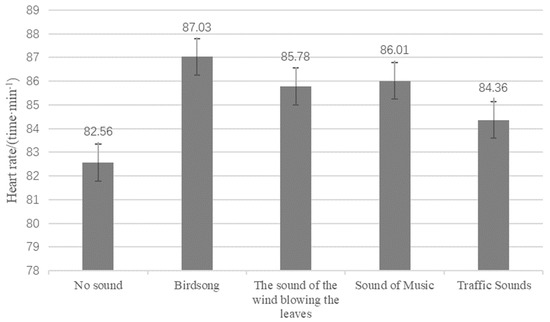 Figure 6 shows the HR changes after hearing different types of sound stimulation. As the figure shows, the changes in HR after hearing birdsongs, rustling leaves, music sounds, and traffic sounds were 5.41%, 3.90%, 4.18%, and 2.18%, respectively. Compared with the control group, the increase in HR indicates increased sympathetic nerve activity, to some extent. The greater the increase in HR, the more the residents tended to be excited or happy. According to the HR changes for different types of sounds, birdsongs, rustling leaves, and music have positive effects. Here, birdsongs showed the strongest effect, whereas the sound of wind blowing on leaves had the weakest effect.