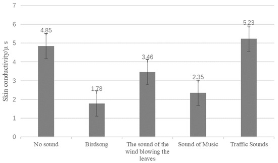 The statistical analysis of the changes in SCL for various sound types found that after listening to the control group and then listening to other sound sources, the SPL appeared to have a certain decreasing trend, except for traffic sounds. The SCL changes after hearing birdsongs, music sounds, rustling leaves, and traffic sounds are −63.30%, −51.55%, −28.66%, and 7.84%, respectively (Figure 7). It was found that birdsongs strongly influenced the human body’s mood of pleasure or relaxation, followed by music, and finally, by the sound of rustling leaves. The sound of traffic did not produce pleasure or relaxation.