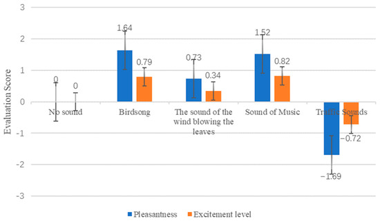Figure 8 shows the evaluation scores of pleasure and excitement changes under different sound source backgrounds. As Figure 8 shows, the evaluation of the pleasure and excitement degrees for traffic sounds is negative, indicating that people reject the urban noise environment. The remaining recordings were rated positively, suggesting that such sounds brought people a distinct sense of pleasure and excitement. There were differences in evaluating the degrees of pleasure and excitement among different sounds. The scores of the degrees of pleasure and excitement for birdsongs (1.64 and 1.52) and music (0.79 and 0.82) were higher. The scores for wind blowing on leaves were the lowest, which were 0.73 and 0.34, respectively, indicating that all three kinds of sound sources positively affected human psychology. The effects of birdsongs and music are more pronounced. As Table 5 shows, the results show that HR and SCL were correlated with pleasure and excitement at p < 0.01, indicating that physiological indexes could comprehensively reflect the psychological changes of the human body, to a certain extent. There was a significant positive correlation between HR and the degrees of pleasure and excitement, and a significant negative correlation between SCL and the degrees of excitement and pleasure. In summary, when the human body is in a state of pleasure and excitement, the HR will show an increasing trend, while the SCL will show a trend of decline.