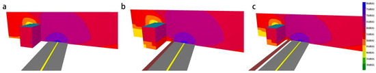 Cross-section simulation of street-facing building noise: (a) without acoustic barrier; (b) with an acoustic barrier; (c) with an acoustic barrier at 2 m.