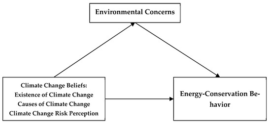 Through the above literature review, it can be concluded that environmental concerns are the driving force of climate change beliefs and engagement in energy-conservation behaviors. Values are integrated in verbal and nonverbal symbols, communication patterns, daily routines, material culture, social institutions, and the ways people structure and relate to their natural and social surroundings [63]. Values define and bind groups, organizations, and societies, serve an adaptive role, and are typically stable across generations. When abrupt value changes occur, they are in response to substantial alterations in the social–ecological context. Such changes build on prior value structures and do not result in complete replacement [64]. However, the factors that determine the strength of environmental concerns have not yet been identified, and there is also a lack of in-depth research on the mechanism involved in the above relationship. Therefore, the present research intends to study how environmental concerns drive engagement in energy-conservation behaviors in the Chinese context. Specifically, this paper analyzes the influencing factors for environmental concerns and engagement in energy-conservation behaviors among young people in order to develop policy suggestions that can assist the construction of a low-carbon society. Additionally, this study adopts structural equation modeling to verify the mediating impact of environmental concerns on the relationship between climate change beliefs and engagement in energy-conservation behaviors among adolescents.