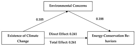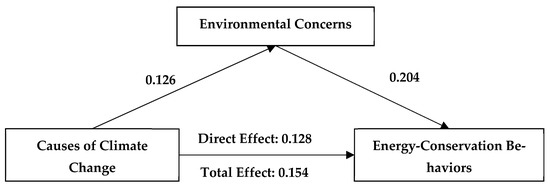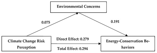 We applied Pearson correlation analysis to test the mediating effect of environmental concerns on the relationship between climate change beliefs and engagement in energy-conservation behaviors. The results showed that the influence of climate change beliefs on young people’s engagement in energy-conservation behaviors occurs through both a direct effect and through a mediating effect of environmental concerns. Specifically, the direct effect of climate change beliefs on youths’ engagement in energy-conservation behaviors was significant (β = 0.241; 95% confidence interval [0.208, 0.275]), while the mediating effect of environmental concerns was also significant (β = 0.02; 95% confidence interval [0.012, 0.029]). The direct effect of climate change causes on youths’ engagement in energy-conservation behaviors was also significant (β = 0.122; 95% confidence interval [0.089, 0.155]), as was the mediating effect of environmental concerns (β = 0.026; 95% confidence interval [0.017, 0.037]). The direct effect of climate change risk perception on youths’ engagement in energy-conservation behaviors was significant (β = 0.274, 95% confidence interval [0.244, 0.304]), while the mediating effect of environmental concerns was also significant (β = 0.015, 95% confidence interval [0.008, 0.022]). The above results verify H2 (Figure 2, Figure 3, Figure 4 and Table 2).
