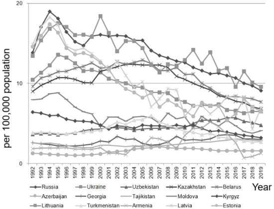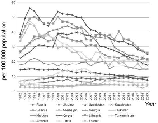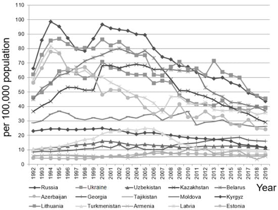 The main reasons that individuals attempt or commit suicide are personal problems, social problems, or combinations of both. According to the World Health Organization, 703,000 people worldwide died as a result of suicide in 2019, and the largest portion of these suicides occurred in low-and middle-income countries, including the independent countries formed as a result of the 1991 collapse of the Union of Soviet Socialist Republics (USSR, or the Soviet Union) [,]. The 15 post-Soviet countries are the Republic of Armenia (Armenia), the Republic of Azerbaijan (Azerbaijan), the Republic of Belarus (Belarus), the Republic of Estonia (Estonia), Georgia, the Republic of Kazakhstan (Kazakhstan), the Kyrgyz Republic (Kyrgyzstan), the Republic of Latvia (Latvia), the Republic of Lithuania (Lithuania), the Republic of Moldova (Moldova), the Russian Federation (Russia), the Republic of Tajikistan (Tajikistan), Turkmenistan, Ukraine, and the Republic of Uzbekistan (Uzbekistan) []. We will first provide our present major findings regarding the suicide statistics in these individual countries.