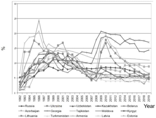 The minimum–maximum annual unemployment rates (%) during the study period were: Armenia 1.80–19.01, Azerbaijan 1.80–11.80, Belarus 3.10–24.40, Estonia 3.68–16.71, Georgia 5.40–20.71, Kazakhstan 1.00–13.46, Kyrgyzstan 1.10–12.55, Latvia 6.05–20.70, Lithuania 1.20–17.81, Moldova 2.98–11.14, Russia 4.59–13.26, Tajikistan 2.10–16.50, Turkmenistan 1.50–12.70, Ukraine 1.90–11.86, and Uzbekistan 2.90–13.30 (Figure 4).