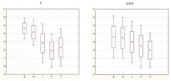 Reliability of individual information sources. Reliability of information sources: S—scientific source (academic lectures, medical literature, conferences, other courses), H—health professionals, I—internet sites dedicated to COVID-19, F—friends and social media, T—traditional media (radio, television, press); V—vaccinated, NWV—not wanting to vaccinate (mean, standard deviation, 1.96 × standard deviation).
