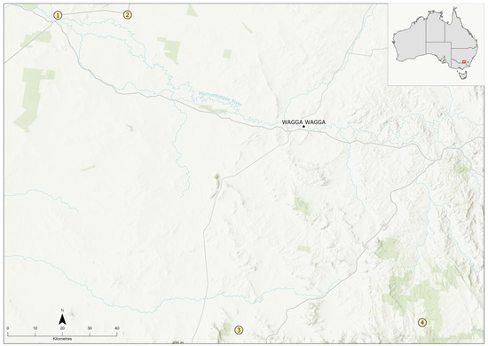 A total of 275 snails were collected from various localities, as shown in Figure 1. The collection localities were a combination of aquaculture fishery ponds (locations 1 and 2) and natural creeks (locations 3 and 4). The collection took place during summer and autumn months in the southern hemisphere (February–April 2019). The snails were collected in large specimen jars, approximately half-full of water, and were transported to the Parasitology Laboratory of Charles Sturt University. The snails were identified using Ponder (2020), and all of them were examined by autopsy as described previously [13]. Some parasite specimens were preserved in 70% ethanol for molecular work, and some were mounted permanently in glycerin jelly.