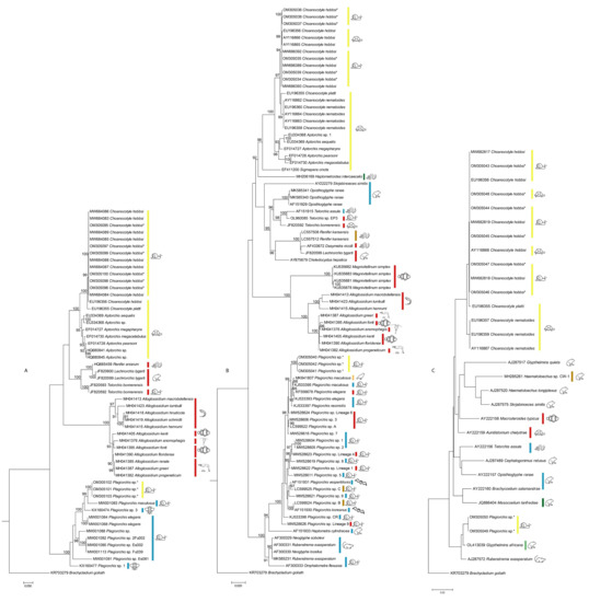 The sequences were aligned using BioEdit [14]. Primer sequences were removed from analysis. ITS2 sequences of closely related taxa were obtained from GenBank for phylogenetic analyses (Table 1). Where possible, we used sequences obtained from adult specimens associated with morphologically well-identified specimens and peer-reviewed published works. Alignments for ITS2, 28S, and 18S for group A and morphotype B were 1275, 1269, and 1777 bp, respectively. For morphotype C, the alignments of the same regions were 1523, 1225, and 1754, respectively. Descriptions of the groups/morphotypes are provided in the Results section. Alignment gaps were excluded for analyses. Pairwise genetic distances were calculated using MEGA X [15]. The GTR + G, GTR + I + G, and HKY + I models were selected for ITS2, 28S, and 18S regions, respectively, as best fit evolutionary models as inferred by the jModelTest 2 [16]. Brachycladium goliath (KR703279) was used as an outgroup for Choanocotyle and Plagiorchis sp. phylogenetic analyses, as it belongs to the same suborder Xiphidiata but different superfamily. Philophthalmus gralli (JX121229 and JQ627832) were used as an outgroup for Petasiger sp. phylogenetic analyses, as it belongs to the same superfamily but different family. The phylogeny of selected sequences was calculated using MrBayes 3.2 [17] for 3,000,000 generations for each gene region, with other parameters set as default, until the average standard deviation was lower than 0.005. The first 50% of runs from the Markov chain Monte Carlo algorithm were discarded as burn-in. The tree was visualized using Figtree v 1.4.3 [18].