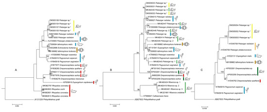 17. Ronquist, F.; Huelsenbeck, J. MrBayes 3: Bayesian phylogenetic inference under mixed models. Bioinformatics 2003, 19, 1572–1574. [Google Scholar] [CrossRef]