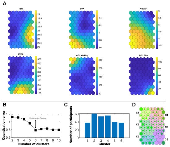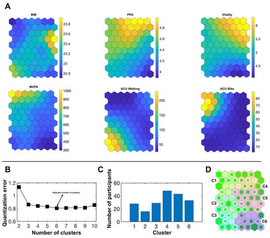 MVPA, ACU by walking, ACU by cycling, subjective vitality, PPA and BMI were included as input variables in a self-organizing maps (SOM) analysis [61] in order to identify typical clusters regarding the interplay of these variables of interest. It was conducted with Matlab R2018a (Mathworks Inc., Natick, MA, USA) and the SOM toolbox (version 2.0 beta) for Matlab [62]. The dataset is provided as Supplementary File Data S1.