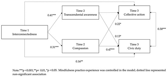 Analysis on Pearson correlation among the study variables was conducted using SPSS (Version 25). Path analysis was used to test the hypothesized mediation model using Mplus Version 8.7 [51]. Interconnectedness at Time 1 was structured as an independent variable; transcendental awareness at Time 2 and compassion at Time 2 were entered as mediators; and civic duty and collective action participation at time 3 were treated as dependent variables.