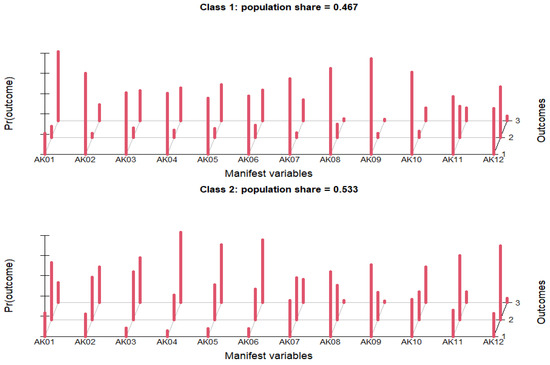 Knowledge was considered satisfactory if ≥80% of the participants answered correctly for each statement. Only 22.23% of the respondents correctly agreed on the statement “Antibiotics kill bacteria” and almost half, 49.19%, to the statement “Antibiotics treat the majority of diseases”. While the question might seem ambiguous, its purpose was to gradually depict the general knowledge of the population regarding antibiotic use, followed by more specific questions. In this context, the confusion about whether or not antibiotics treat the majority of diseases was apparent in this survey, since a quarter of participants (24.31%) were unsure about this subject. There was also a great confusion about the effectiveness of antibiotics on viruses, since only 32.88% correctly disagreed on the statement “Antibiotics treat viral infections”, and 37.51% believed that antibiotics treat viral infections and 29.61% were unsure. Furthermore, the majority of respondents incorrectly agreed on three statements regarding the effectiveness of antibiotics: “Antibiotics reduce pain and inflammation” (52.31%), “Antibiotics significantly reduce fever” (47.27%) and “Antibiotics help a lot with dental pain” (47.12%), and only one third disagreed (31.17%, 30.18% and 31.22%). The respondents unsure of these statements did not exceed 25%. Over 1/2 of respondents (53.87%) responded correctly to the statement “Excessive antibiotic use leads to AMR”, while those unsure or those who did not agree with this statement were 24.31% and 21.82%, respectively. Of the respondents, 73.77% and 81.77% correctly stated that antibiotics can cause allergies and that antibiotics have side effects, respectively. A considerable percentage (57.35%) was aware that antibiotic treatment should not be stopped when symptoms have disappeared. However, 24.99% presented an incorrect answer for this statement, which is quite worrying in terms of the phenomenon of increased AMR. Respondents were asked to present their opinion on some information about antibiotic resistance and the severity of the phenomenon. The percentage of respondents who agreed with the statement “Animal products can contain antibiotic residues, which may increase AMR when entering the human body” was less than half, specifically 40.57%, while 47.95% were unsure and 11.48% disagreed. The data presented in Table 2 show that 33.3% of respondents agree with the WHO predictions [57] on the severity of antibiotic-resistant microorganisms. In addition, a reduced percentage of respondents (4.52%) did not agree with these forecasts, while the largest percentage of respondents (62.18%) was uncertain. Regarding LCA, respondents who provided more accurate knowledge were grouped into LCA class 1, which comprised 46.7% (n = 899), while the percentage of people who demonstrated less accurate knowledge or uncertainty (LCA class 2) was 53.5% (Figure 1).