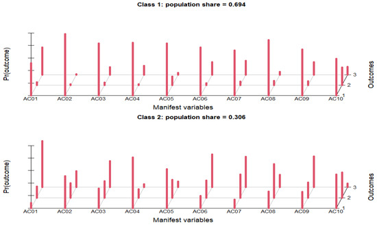 Unexpectedly, over half of the respondents (52.73%) incorrectly agreed with the statement ″I always try to have an antibiotic in the house″, which is considered a negative attitude. The majority (83.64%) had an appropriate attitude disagreeing with the statement ″If a family member feels unwell, I usually give them an antibiotic″, whereas 8.42% incorrectly agreed with this statement. The percentage of respondents who confidently used remaining antibiotics for reoccurring similar symptoms was 21.19%, while the vast majority (67.58%) disagreed. A total of 83.32% of the respondents agreed with the statement ″I use antibiotics according to the instructions for use″. Over half of the respondents (59.43%) disagreed with the statement ″I most often use antibiotics when the symptoms are cold/flu″, which is an appropriate attitude regarding antibiotics consumption. Similarly, 54.23% of respondents showed a correct attitude towards the statement ″I most often use antibiotics when the symptoms are related to toothache″, by disagreeing. Even so, almost 30% of the population participating in the present study agreed with these two statements, demonstrating a misguided attitude towards antibiotic consumption. Only 9.19% agreed with statement ″I most often use antibiotics when the symptoms are related to gastrointestinal disorders″, which means that the use of antibiotics is associated more often with toothaches and colds than with gastrointestinal diseases in the respondent population. Similar percentages of respondents gave appropriate answers to a question that appeared reformulated in both the knowledge and attitude sections, which suggests that respondents who had adequate knowledge of antibiotics were more likely to also have a positive attitude toward the use of antibiotics. If 57.35% correctly disagreed with the AK10 statement from the knowledge section, 58.96% of respondents disagreed with the same statement, which was reformulated as AC09 in the attitude section. The combination of drug–food (AC10), in this case antibiotic–food, is of particular importance to 57.3% of respondents. Moreover, 32% were unsure if the statement ″There are many interactions between antibiotics and food consumed″ was correct, while 10.7% disagreed. Among the demographic variables included in this study, the likelihood of respondents to belong to class 2 vs. class 1 in terms of attitudes towards antibiotic consumption was significantly associated with all five traits (Table 3). Class 2 represented the population with more improper attitudes towards antibiotic consumption and comprised 589 respondents (30.6%), while the percentage of people who showed proper attitudes was more than two-fold (69.4%, n = 1336, Figure 2).