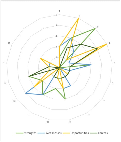 In the case of the external factors, the impact is ambiguous—some of the factors are reinforced and others are hindered. The model works in favor of improving managerial competencies in hospitals and other institutions (O2). Additionally, the threat of data transmission and quality problems (T3) is significantly limited. On the other hand, the model significantly strengthens the threat associated with the resistance of hospitals (T1).