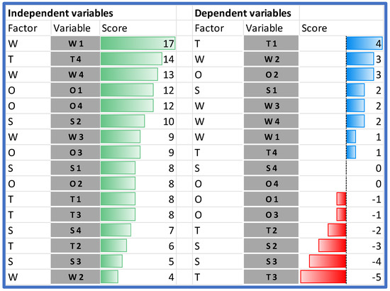 Following the Dynamic SWOT methodology, the impact was determined for each pair of factors as an integer within the range <−2;2>. Items in columns are treated as independent variables (impact) and items in rows are treated as dependent variables (response) (Table 4).