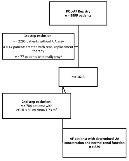 - Wełnicki, M.; Gorczyca, I.; Wójcik, W.; Jelonek, O.; Maciorowska, M.; Uzie˛bło-Życzkowska, B.; Wójcik, M.; Błaszczyk, R.; Rajtar-Salwa, R.; Tokarek, T.; et al. Hyperuricemia as a Marker of Reduced Left Ventricular Ejection Fraction in Patients with Atrial Fibrillation: Results of the POL-AF Registry Study. J. Clin. Med. 2021, 10, 1829. [Google Scholar] [CrossRef]
