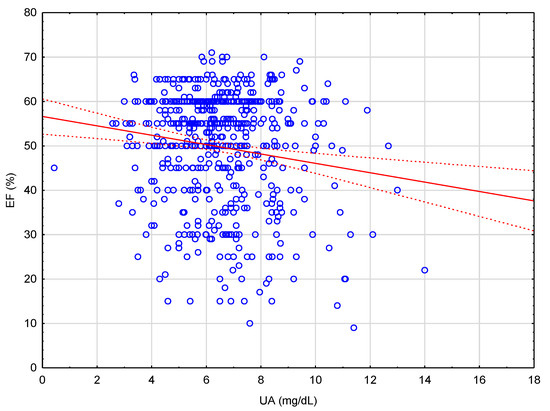 | Variable | eGFR (mL/min/1.73 m2) | UA (mg/dL) | EF (%) | Age (years) | BMI (kg/m2) |