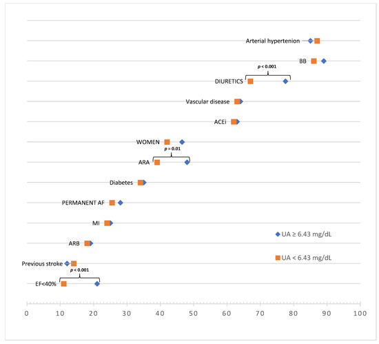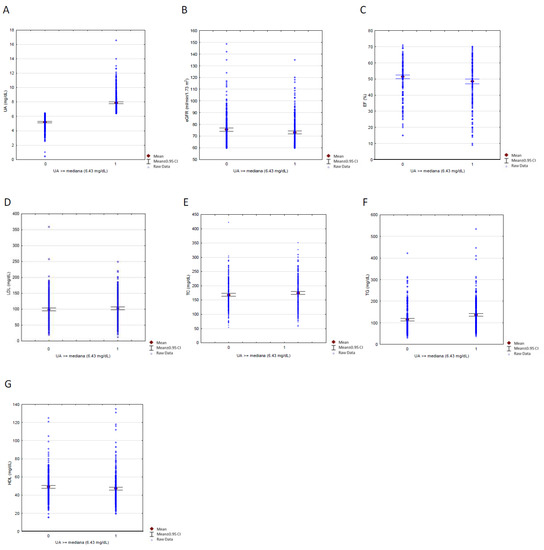 3.3. Comparison of Patients with High vs. Low Uric Acid Concentrations