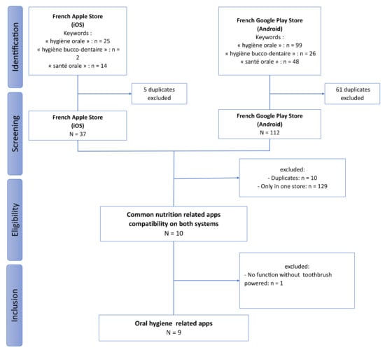 Two university researchers made the selection of applications related to oral hygiene between 28 February and 2 March 2022. The search was conducted on the French App Store (iOS) and the French Google Play Store (Android). The words used for the search were “hygiene orale” (oral hygiene), “hygiène bucco-dentaire” (oral and dental hygiene), and “santé orale” (oral health). Due to the fact that the use of truncation or logical operators (AND, OR, and NOT) was not possible in the App Store and Google Play Store, each search term was entered separately.