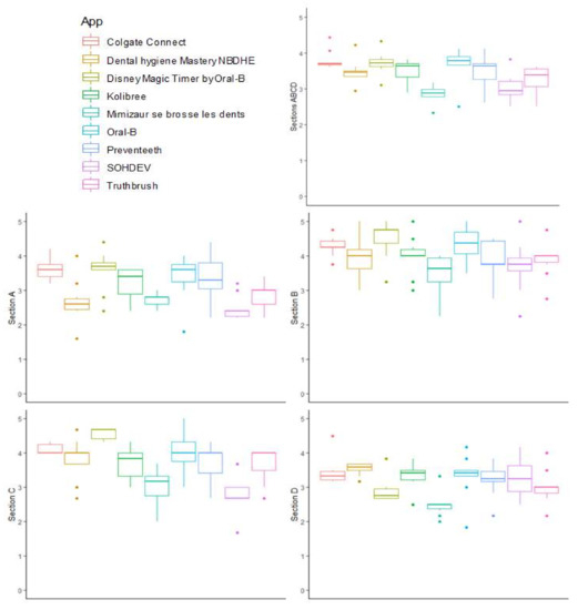 The best overall quality MARS scores (sections A, B, C, D) (Figure 2 and Supplementary Tables S10 and S11) were obtained by Oral-B (3.4 ± 0.97), Colgate Connect (3.20 ± 0.63), and Preventeeth (3.10 ± 1.1); whereas the worst overall quality MARS scores were obtained by Mimizaur se brosse les dents (1.80 ± 0.79) and Kolibree (2.30 ± 0.82).