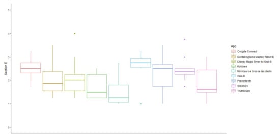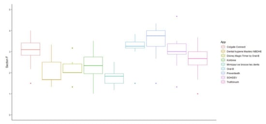 The scores analyzing the specificity (section F) of the content of the apps (Figure 4) ranged from 3.46 ± 0.84 for Preventeeth, to 1.78 ± 0.47 for Mimizaur se brosse les dents. The best specificity quality scores were obtained by Preventeeth, Oral-B (3.15 ± 0.62), Santé Orale-SOHDEV (3.01 ± 0.85), Colgate Connect (2.94 ± 0.72), and Truthbrush (2.55 ± 0.75); whereas the worst specificity quality scores were obtained by Mimizaur se brosse les dents, Dental Hygiene Mastery NDBHE (2.08 ± 0.74), Disney Magic Timer by Oral-B (2.34 ± 0.56), and Kolibree (2.31 ± 0.69).