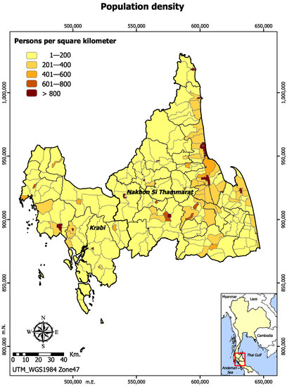 As of 2017, most of the administrative units in both Krabi and Nakhon Si Thammarat had a population density of 1 to 200 persons per square kilometer as shown in Figure 2.