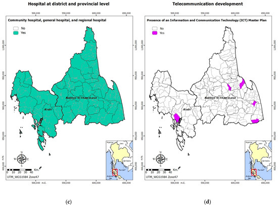 In both provinces, Tambon Health Promoting Hospitals were available in most of the Tambon areas, as shown in Figure 4b. All subdistricts in both provinces were at least covered by either a functional hospital, either at community level, district level, or regional level, as shown in Figure 4c. Very few subdistricts in both provinces had Information and Communication Technology (ICT) master plans in place; however, Nakhon Si Thammarat had more Tambon areas with the master plans than Krabi, as shown in Figure 4d.
