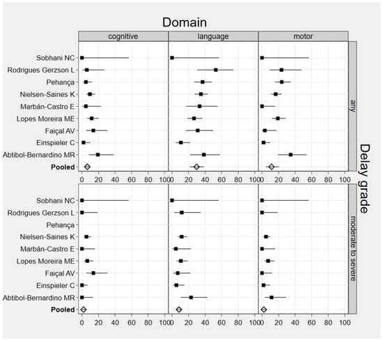 Details on the information obtained in the assessment of the risk of bias and quality of included studies can be found in Table S4 of the Supplementary Materials. There were seven articles presenting at least one category of high risk; thus, certainty of the evidence was very low. There were two articles with at least one category of uncertain risk, and thus of moderate evidence. The main reason for the low quality in the outcome assessment was the very small sample size. There were also differences in the exposure and outcome ascertainment and high levels of heterogeneity in the populations under study. Absolute sample size is small, and these were very select populations (prenatal ZIKV exposure, normocephalic and no apparent ZIKV birth defects, and long-term follow up). The studies contributing a higher sample size to the pooled prevalence were those from Nielsen-Saines K. et al. (n = 146) [26], Lopes Moreira M.E. et al. (n = 94) [10], and Peçanha P.M. et al. (n = 84) [37]. The studies with the highest level of uncertainty were Sobhani N.C. et al. (n = 3) [27] and Abtibol-Bernardino M.R. et al. (n = 26) [38]. In addition to unmeasured confounding, difficulties and differences in maternal ZIKV ascertainment, including uncertainty in gestational age at infection, lack of and differences in ascertainment of socioeconomic status and other markers of vulnerability, and differences in the timing and tools used for outcome ascertainment contributed to the high level of cross-study heterogeneity.