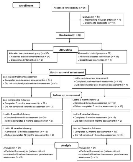 This is a single-blind RCT registered in 2014 (ClinicalTrials.gov, Identifier NCT02319746). The study protocol is described in a previous article conducted by González-Ortega et al. [34]. This RCT fulfills the CONSORT (CONsolidated Standards of Reporting Trials) guidelines, checklist, and flow diagram (Figure 1).