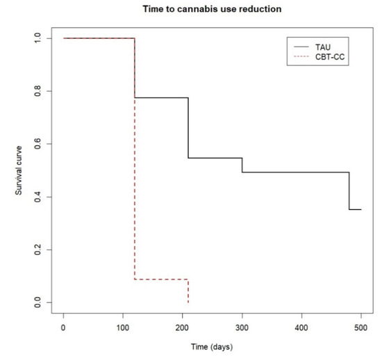 The survival analysis also showed that the CBT-CC group achieved a decrease in cannabis use much earlier than the TAU group (log-rank test: χ2 = 34.34, p ≤ 0.001). In fact, the CBT-CC group had seven times more likely to decrease a category of the severity of consumption than the TAU group (HR = 7.681, 95% CI: 3.58, 16.48). Specifically, the median time indicated that 50% of the CBT-CC group patients reduced cannabis use in less than 120 days, (which coincided with the end of therapy), while in the TAU group the median time was 300 days (Figure 2).