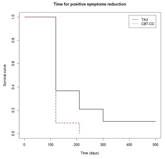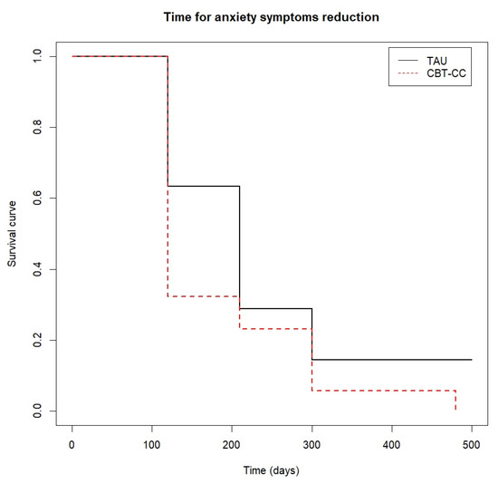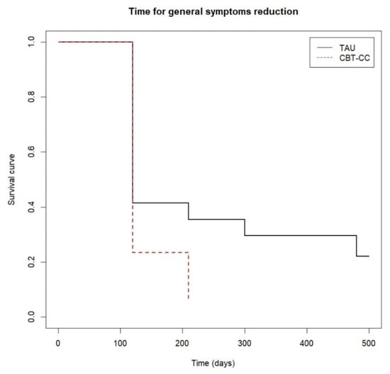 Finally, Figure 6 shows that approximately 80% of the CBT-CC group patients managed to reduce one category in the FAST scale at 120 days (post-treatment) from baseline, while in the TAU group at 210 days (3 months) only 60% of patients achieved improvement criteria. That is, the CBT-CC group managed to improve functionality in less time than the TAU group (log-rank test: χ2 = 7.68, p = 0.05, HR = 1.686, 95%CI: 0.922, 3.081).