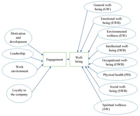 “WB is the state of comfort, health, or happiness. At work, WB is a much broader concept than personal happiness. For employees, the level of WB is related to how satisfied they are with their work and how the organization treats them, especially in their health care” [28] (p. 565). In addition, Inceoglu et al. [29] emphasize that WB supports and increases employee involvement and, therefore, organizational performance and competitiveness for the functioning of organizations.