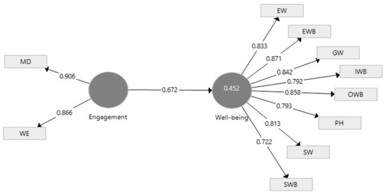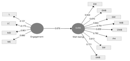 Figure 4 indicates the intensity of the relationship is high, which leads us to find a significant positive influence of the EE on the WB of employees. Furthermore, the f square, which indicates the size effect, has a value of 0.823, strengthening the conclusions on the relationship between EE and WB.