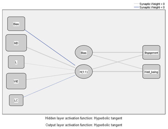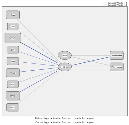 MLP model for identifying the influences of WB dimensions on the overall level of EE and WB. Source: Developed using SPSS v.20 (SPSS Inc., Chicago, IL, USA).