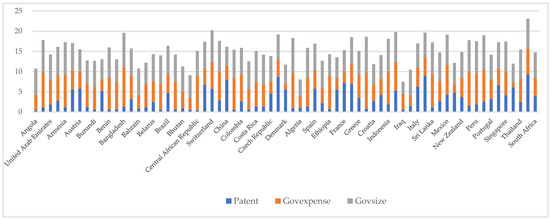 Government size (Govsize): According to the definition of EFW, some research proposed that a total index to measure government size can be derived from measures of government transfer, subsidies, investment, taxation, and other sub-indices, as this index not only includes most of the sub-indices related to government size but can also reflect its size in a more comprehensive, complete, and representative way [58]. As such, inspired by previous studies, we adopted the natural logarithm of government size as a second indicator of the size of a country’s government.